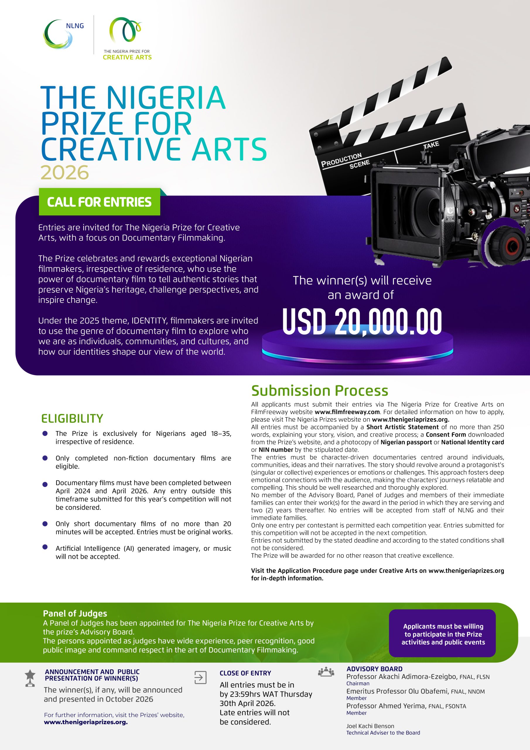 The Nigeria Prize for Creative Arts, with a $20,000 cash reward, aims to project creative forms of art that explore our shared Nigerian identity.