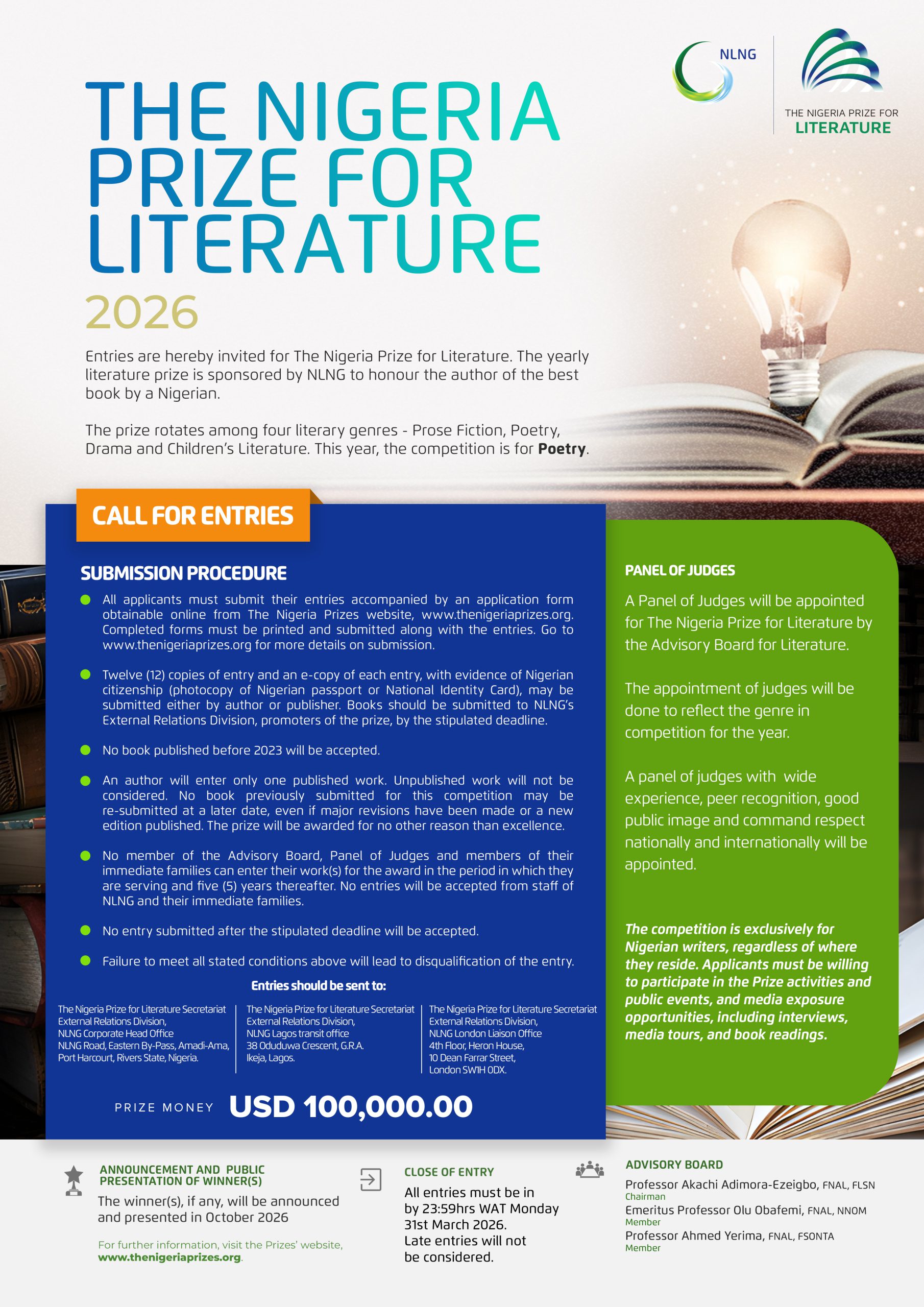 The Nigeria Prize for Literature is one of the 10 richest and most prestigious literary prizes in the world and worth USD100,000 in award money.