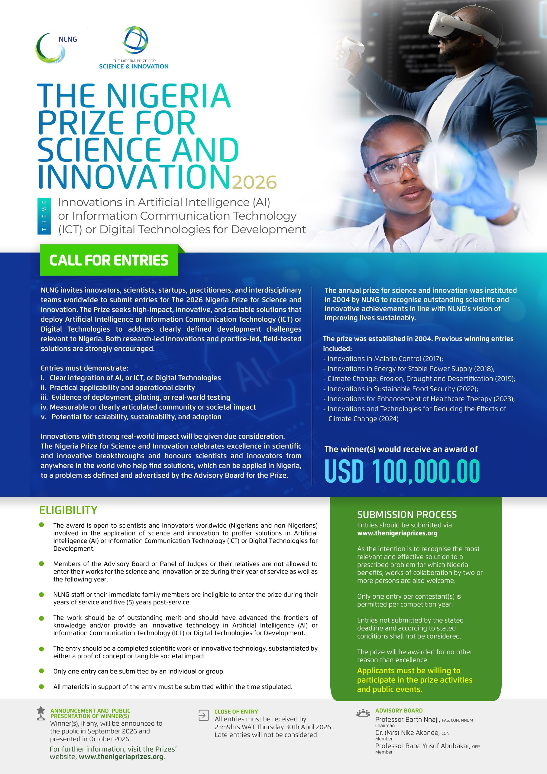 The Nigeria Prize for Science worth USD100,000 in award money, aims at celebrating excellence in scientific breakthroughs and honours scientists.